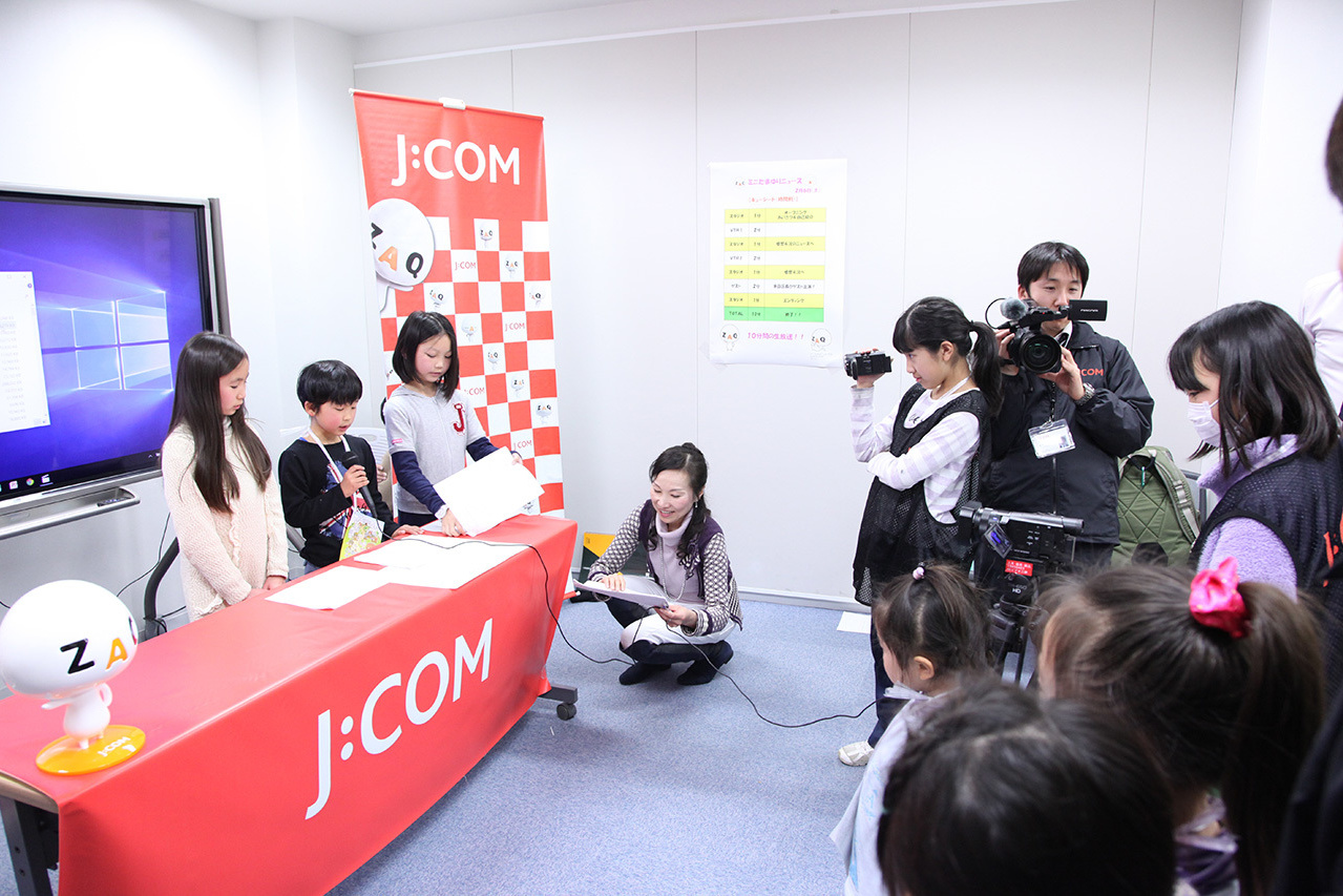 ケーブルテレビJ:COMの協力で実施される本格的なテレビ局の仕事です。参加した子どもたちは、カメラマン、アナウンサー、記者、プロデューサーなどの担当が決められ、皆で協力して番組を作ります。完成した番組は、会場内のスクリーンで放送されます。